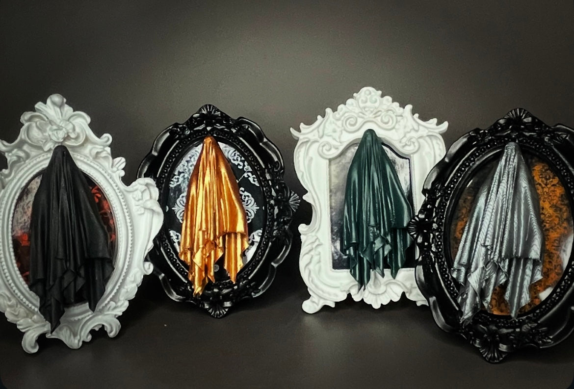 Shrouded in ethereal sheets and resting amongst a wall paper covered background, these mini framed ghouls convey a range of emotions. Some display tearful sorrow, with tears trickling down their ghostly attire while others remain dry-eyed.